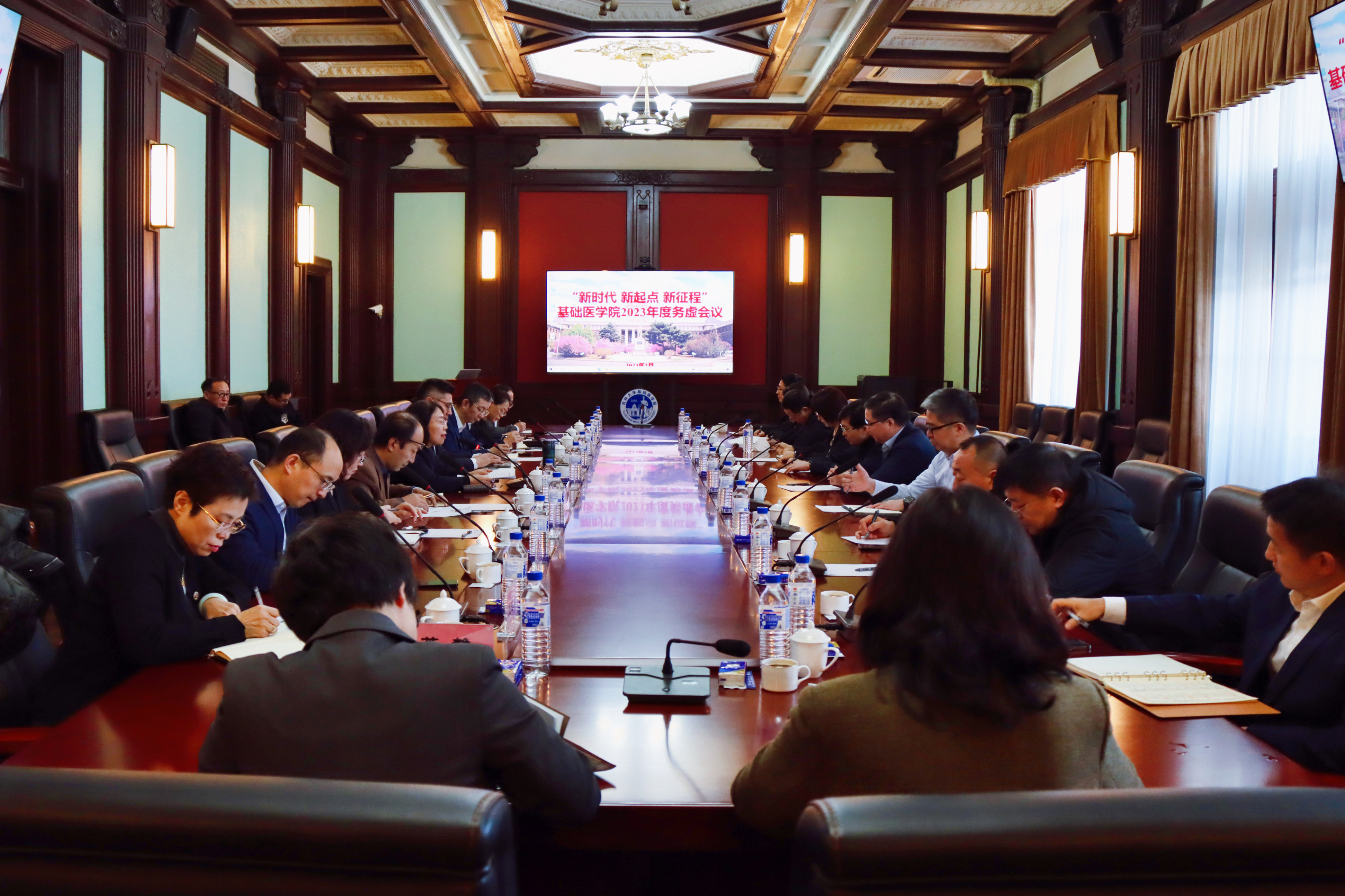 王放院长做总结发言,他聚焦基础医学发展,针对学院在研究生招生、高端人才引进、疫情后国际合作交流及新本科专业课程资源整合等方面提出了2023年学院建设发展的具体规划举措。