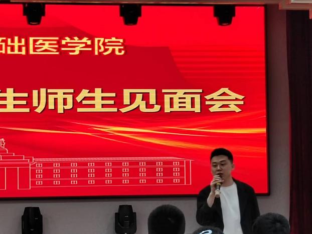 随后,团委书记孙佳钰老师介绍了学院团委和学生会的组建和构成情况,鼓励同学们积极参加学院各类文体活动和社会实践活动,积极投入到校园文化建设中。生物医学科学专业2023级一班班主任辛卓远、二班班主任闫天昊分别从各自专业背景,给予大一同学们大学学习生涯规划建议,引导大家了解生物医学科学专业发展方向和前沿领域,并介绍了指导学生开展科研项目和参加全国竞赛的情况,进一步激发同学们对科研的兴趣和参与学科竞赛的向往。作为学生朋辈力量的代表,研究生兼职辅导员吕欣妍和本科生辅导员助理陈治利、刘天琪三位同学分别介绍了自己在学院的学习生活经验和学生干部工作经历,分享了自己参与学院迎新工作,为学生们提供志愿服务的感悟,同时表达了对学弟学妹们暖心的关怀和未来的期待。