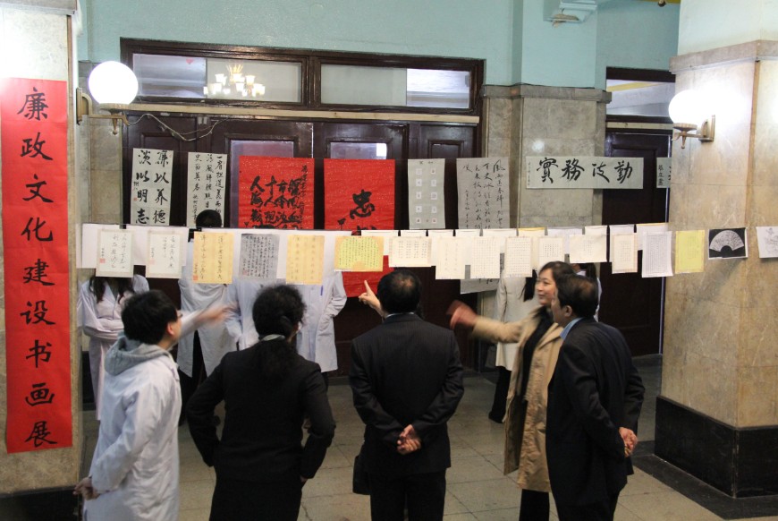 党委组织的“廉政文化建设书画展”在基础楼一楼正厅举行,党委书记孙赵华、院长孙连坤带领班子成员和学院师生一起参观了本次书画展。