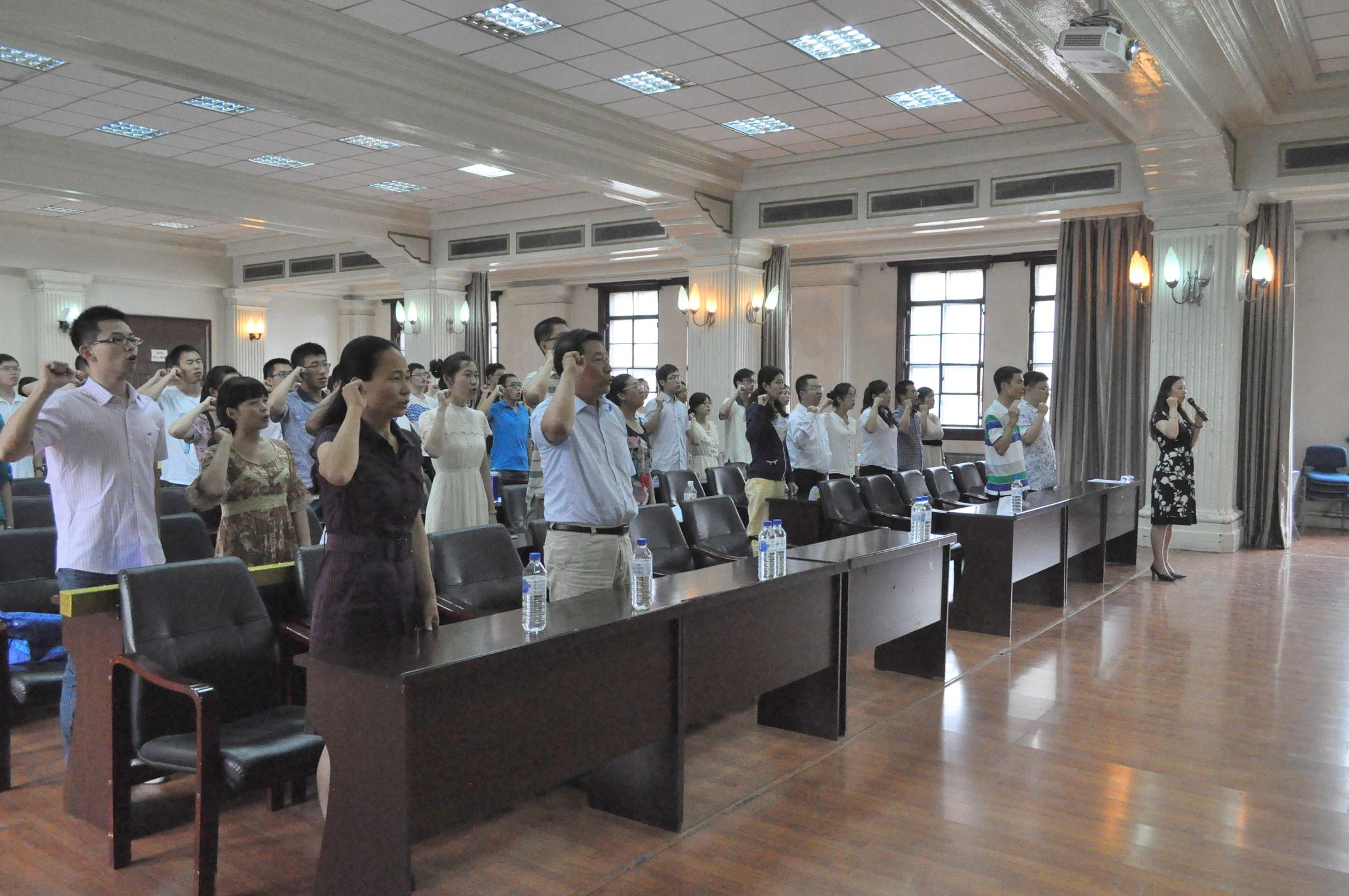 宣誓大会在庄严的《国际歌》中开始,费淑波宣读了预备党员名单。张纪周带领新老党员面向党旗,举起右手,郑重宣誓,表达自己对党的忠诚、对人民的热爱和立志为共产主义奋斗终身的决心。随后,2008级学生预备党员卞亭长代表全体新党员发言,他首先感谢党组织对全体新党员的关心、教育和培养,表示将永远记住这个神圣的时刻,将激励自己终生践行入党誓词,为党的事业奋斗终身。