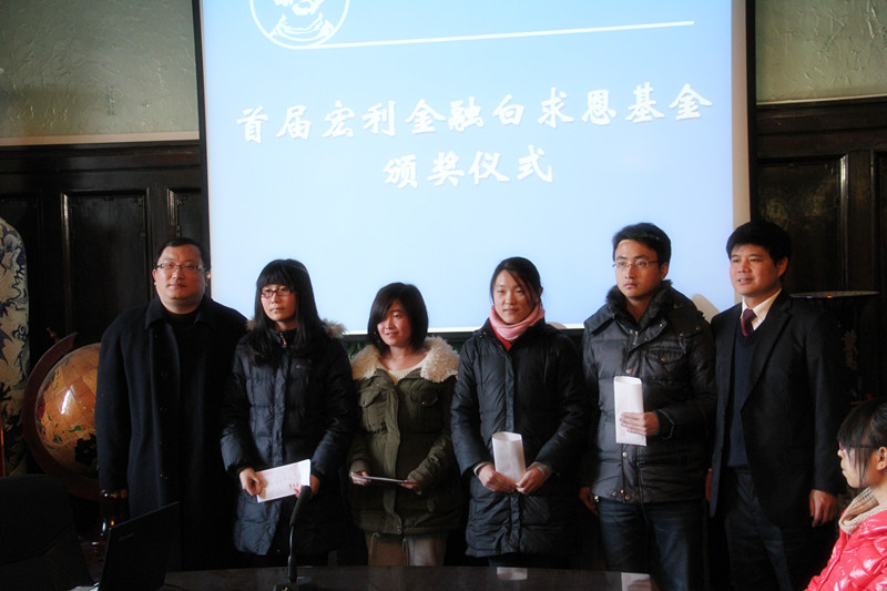 12月30日上午,首届“宏利白求恩基金”颁发仪式在吉林大学白求恩医学院三楼会议室正式举行。中宏保险首席市场执行官姚兵先生及公关部王晨女士专程从上海赶来参加颁发仪式。白求恩医学院党委书记屈英和,学生工作办公室主任吴剑锋,团委书记夏燕来,辅导员魏宇航以及荣获2011年宏利奖、助学金的全体学生参加了本次颁发仪式。仪式由党委副书记兼副院长苑锐主持。