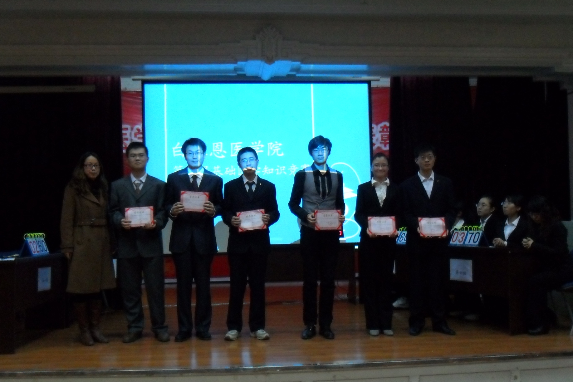为加强医学生对基础医学知识的掌握程度、活跃学术气氛、加强学院医学人文环境建设,11月3日晚,白求恩医学院第二届基础医学知识竞赛决赛在基础楼二楼多功能学术报告厅隆重举办。担任本次竞赛的评委有吉林省解剖学会常务理事兼秘书长、白求恩医学院人体解剖学系教授李幼琼、白求恩医学院生物化学教研室副教授刘畅及生理学系讲师于蕾,白求恩医学院党委副书记兼副院长苑锐也应邀参加了本次活动。