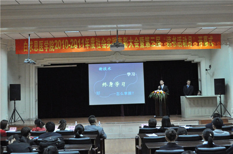 10月10日晚,白求恩医学院2010—2011年度社会实践表彰大会暨第三届“读书月活动”开幕式在基础楼二楼多功能学术报告厅举行。吉林大学团委志愿者工作部部长张尧、白求恩医学院党委副书记兼副院长苑锐、教务办副科级秘书姜威,团委书记夏燕来及全体辅导员出席本次大会。大会由白求恩医学院学生会秘书长续晋宇主持。