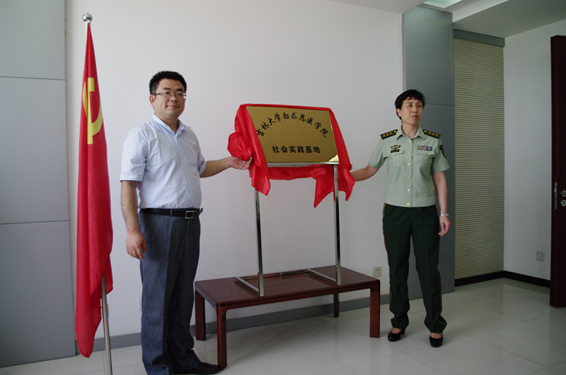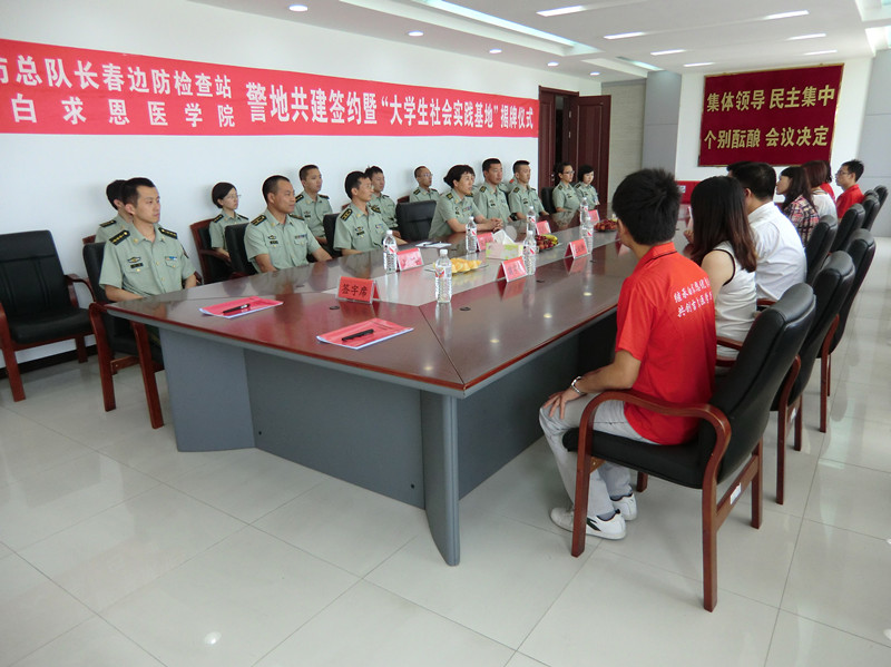 活动中,首先进行了吉林省公安边防总队长春边防检查站与吉林大学白求恩医学院警地共建签约暨大学生社会实践基地揭牌仪式,仪式由吉林省公安边防总队长春边防检查站副政委宋彦斌主持。吉林省公安边防总队长春边防检查站站长孟庆君首先发表讲话,代表该站对白求恩医学院全体师生的到来表示欢迎,并为大家介绍了检查站的基本信息与职能,同时表示希望能够和白求恩医学院在今后的日子中有更多的沟通和交流机会。随后,苑锐发表讲话,简短精炼的介绍了白求恩医学院的历史进程、发展现状及专业设置,介绍了学院以“传承白求恩精神,拓展医学生素质”为主的培养目标,同时感谢吉林省公安边防总队长春边防检查站为学院学生提供了这样一个互补交流、拓宽视野的机会。随后,苑锐和孟庆君共同签署了警地共建协议,并为“白求恩医学院社会实践基地”揭牌。吴剑锋、夏燕来代表学院为检查站捐赠了药品。