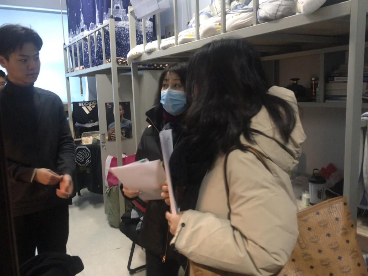学院老师逐一进入每个宿舍,深入细致地检查每间宿舍的情况,并同住校生们进行亲切交谈,详细了解每位学生的思想动态及生活状况,督促学生一定要加强宿舍公共卫生和个人卫生,要勤洗手,戴口罩,多通风。在校期间一定要做好卫生防疫工作,减少非必要出行,时刻做好自身的安全防护,绝不能放松警惕。严格按相关规定和要求做好实验室和寝室消毒消杀工作,进一步加强和落实疫情防控期间的防疫工作。同时给每个寝室发放了《留校学生每日必做清单十一项》,督促学生严格按照上面的规定执行。
