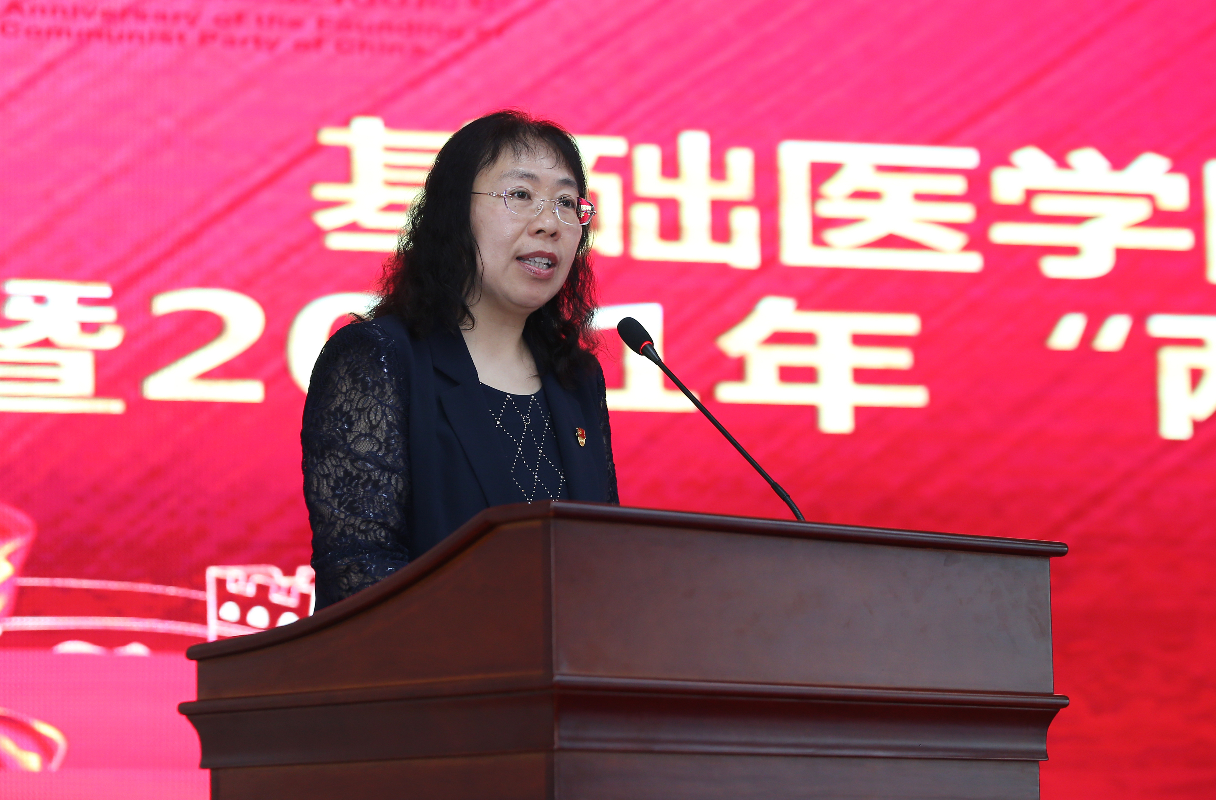 党委书记王晓荣在大会上讲话。她代表学院党委向受表彰的党员和党支部表示热烈的祝贺,向自抗击新冠肺炎疫情以来,坚持战斗在教学、科研、管理一线的学院全体党员表示衷心的感谢和崇高的敬意。她回顾了自2020年以来,面对疫情的考验,中国共产党展现的强大领导力和治理能力,党和国家在统筹推进疫情防控和经济社会发展工作的同时,也为基础医学事业的发展指明了方向;她总结了2021年学院党委开展的各项工作,凝练了70年奋进的学院精神,希望全体党员不断加强学习、统一思想,提高政治站位,将全部精神凝聚到为学院教学、科研事业的发展上来,不辜负党和国家的嘱托、不辜负伟大的时代。