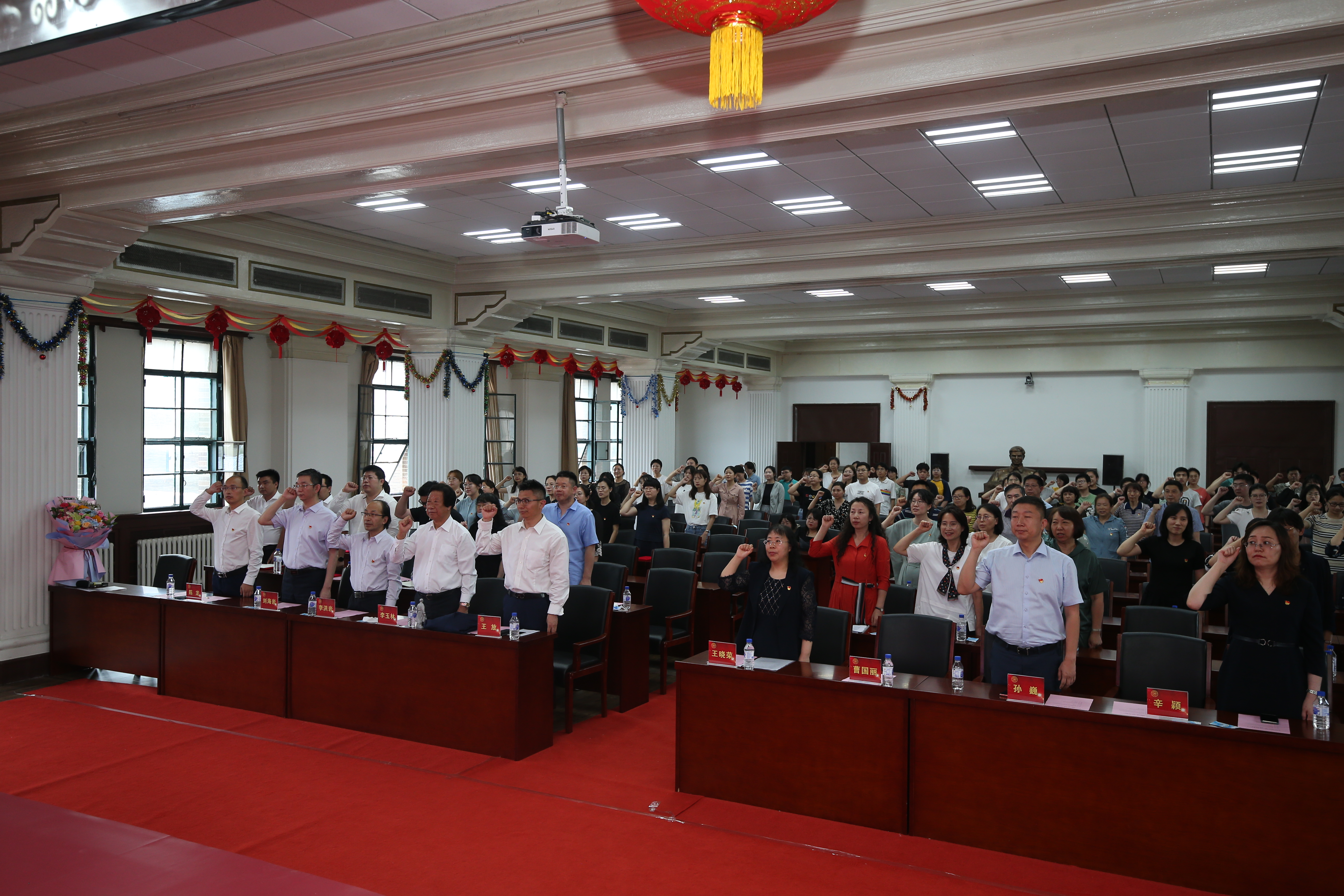 随后,新入党党员和全体党员再次举起右手,面对党旗庄严宣誓,重温入党誓词。