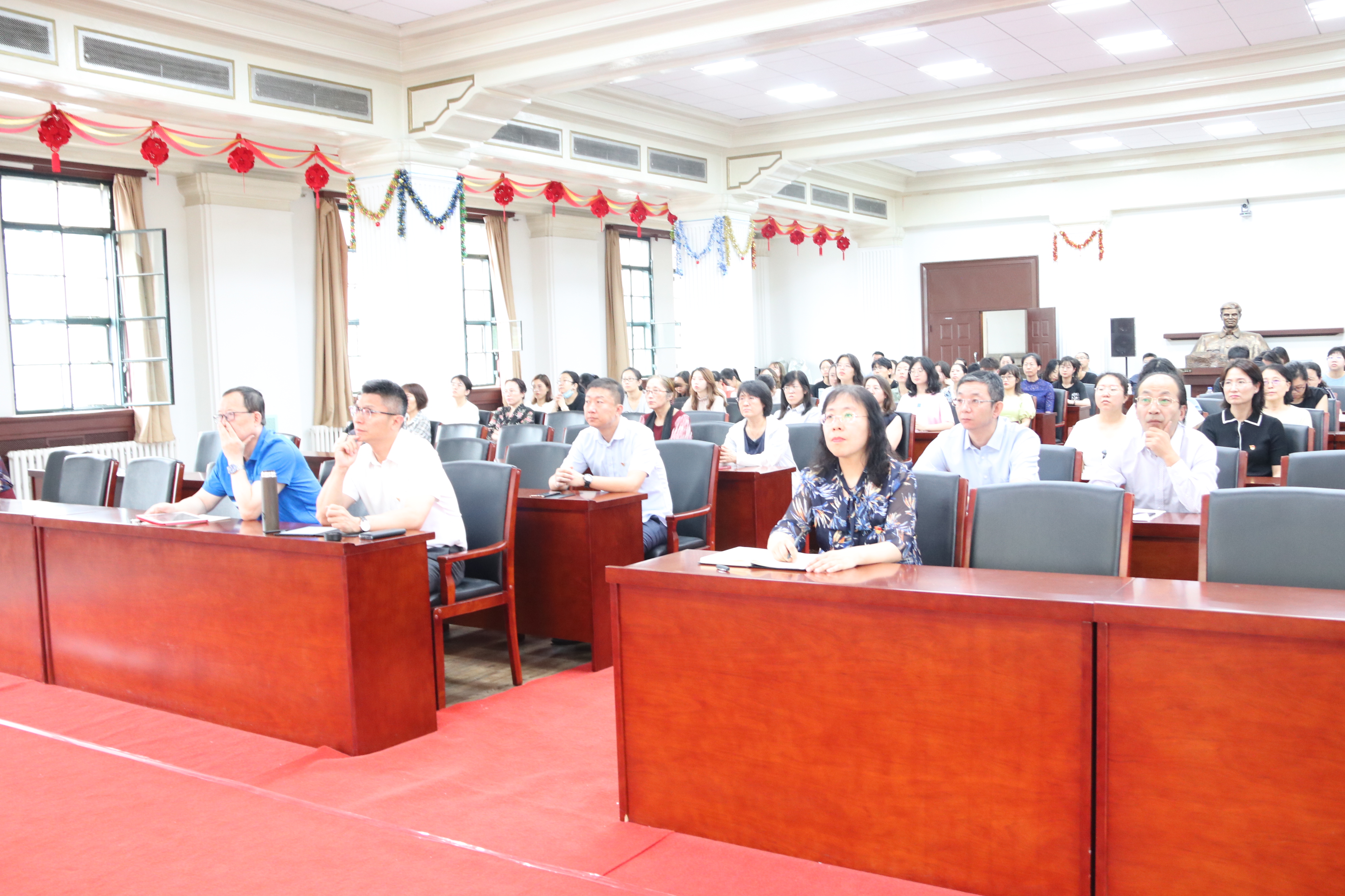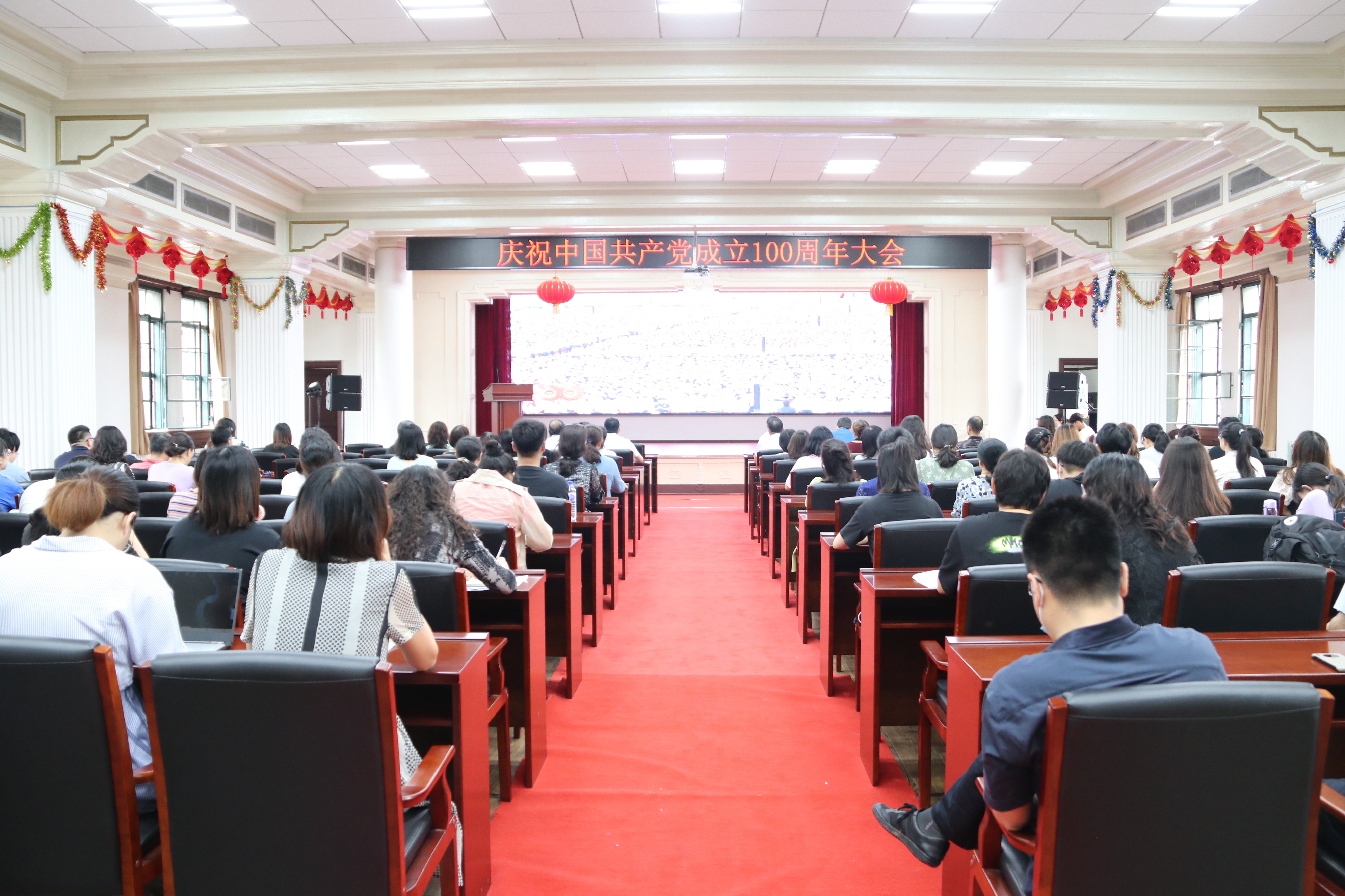 领导班子成员、党委委员、党支部书记、全体中层管理干部、全体教职工党员在基础楼二楼多功能厅集中收看了庆祝中国共产党成立100周年大会盛况。