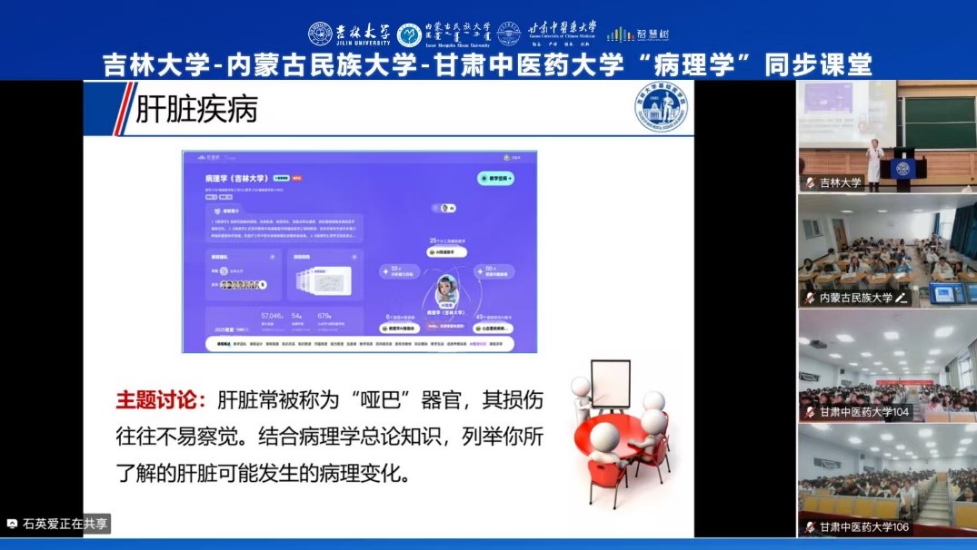 病理学系石英爱教授主讲。课堂采用"理论讲授+临床案例解析+实时互动"的教学模式,通过高清影像传输技术,将吉林大学的优质教学资源实时输送至西部高校课堂。
